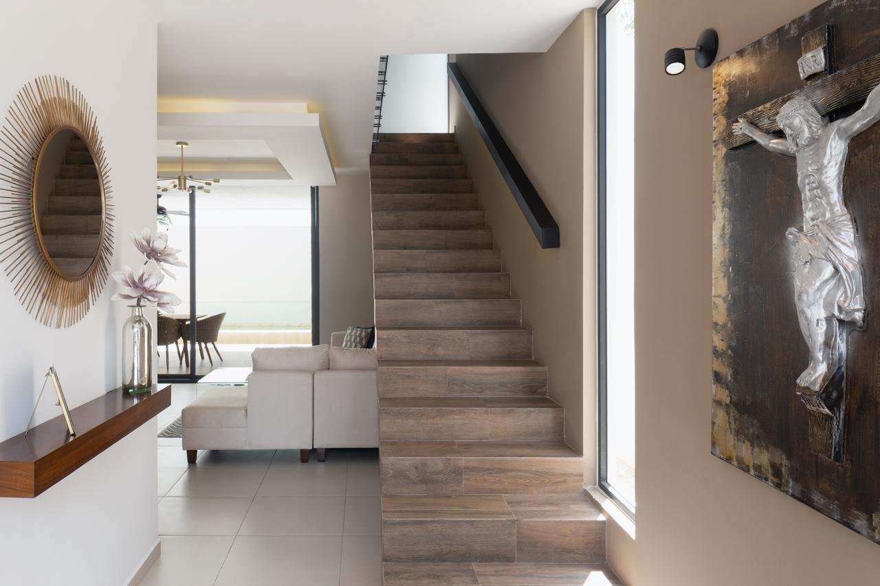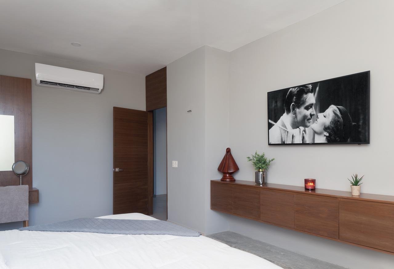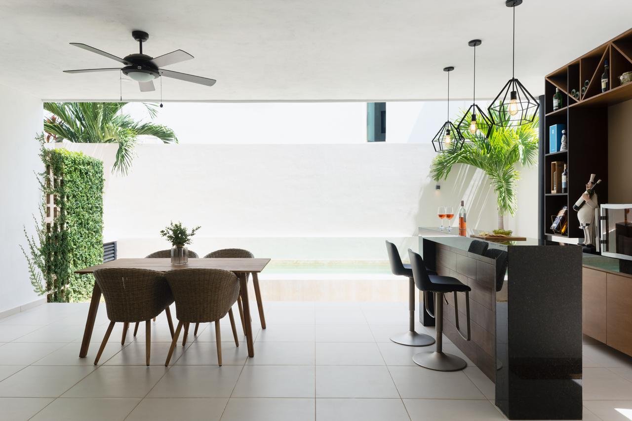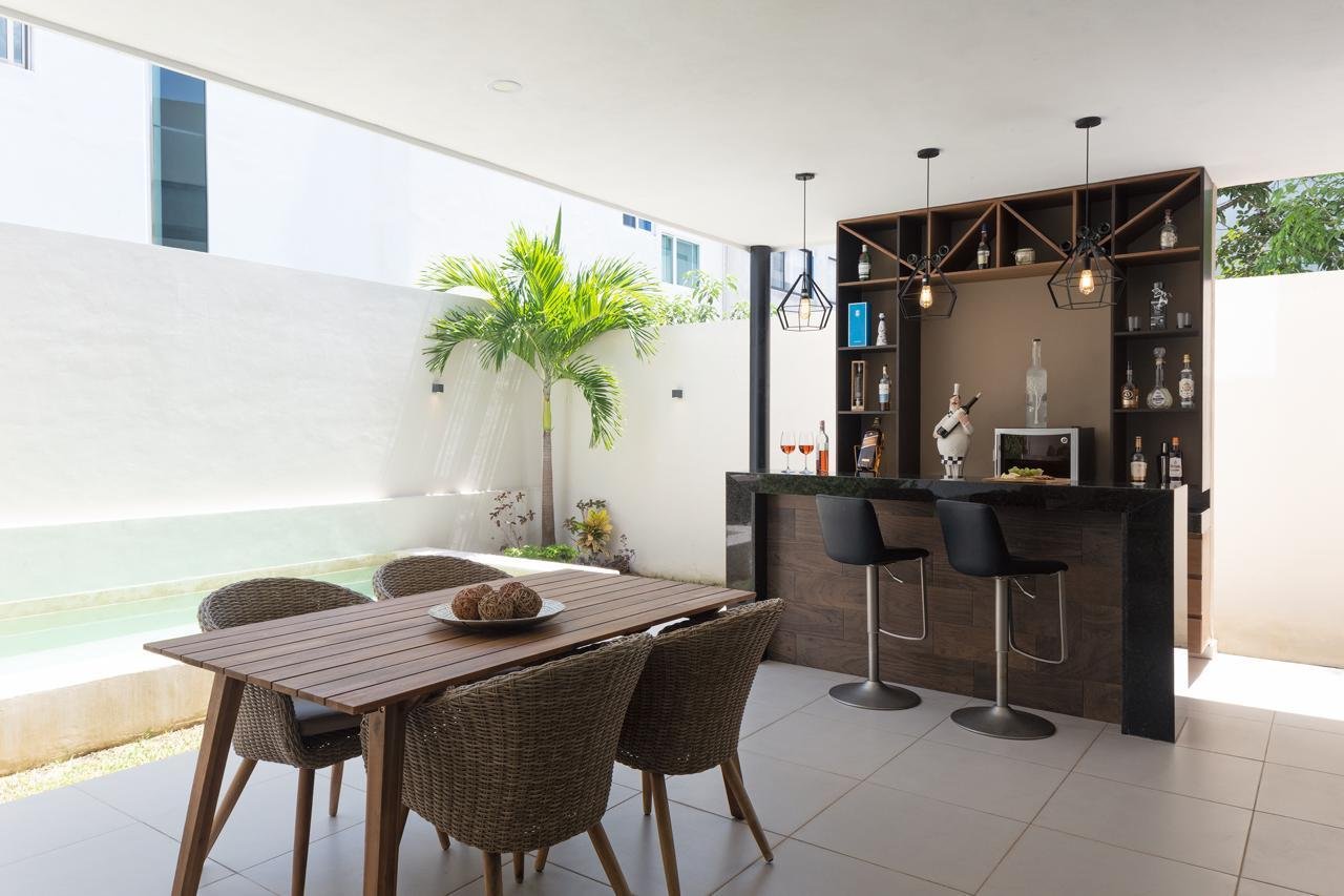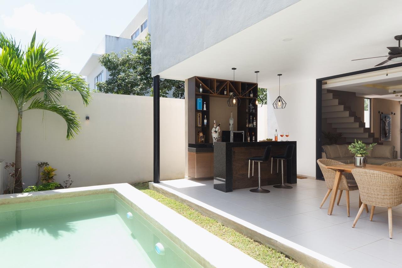 Casa:- Terreno 210m2 (10 x 21)- Construcción 260m2 en 2 plantas- Cocina integral completa – 3 recamaras con baño, closet, y A/A cada una.- Cortinas/persianas Blackout- Medio baño- Rec. principal con balcon y walk-in closet amplio- Estancia/Sala TV en planta alta- Mueble de blancos- Ventiladores- Terraza exterior techada amplia con bar- Alberca privada- Pasillo de servicios – Bar- Cuarto de servicio c/baño- Cuarto de lavado- Cochera techada para 2 autos- Alarma de seguridad via celular- Cámaras de seguridad
