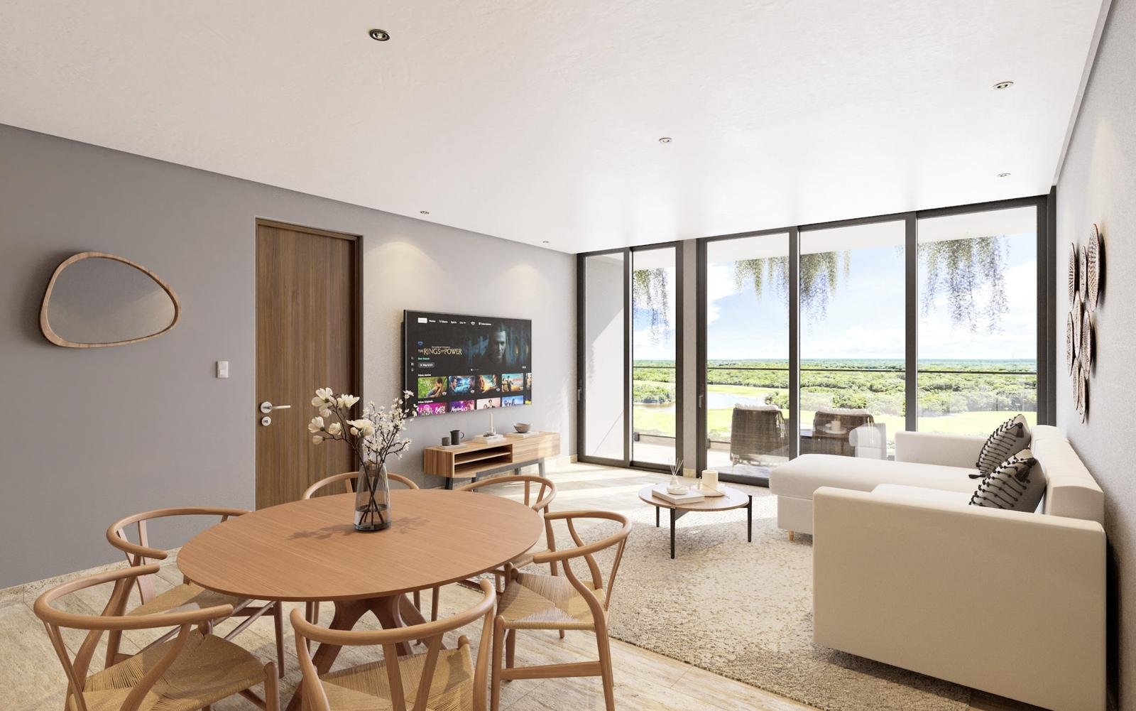 Área Social: Estancia fluida de sala y comedor con acceso a terraza privada.