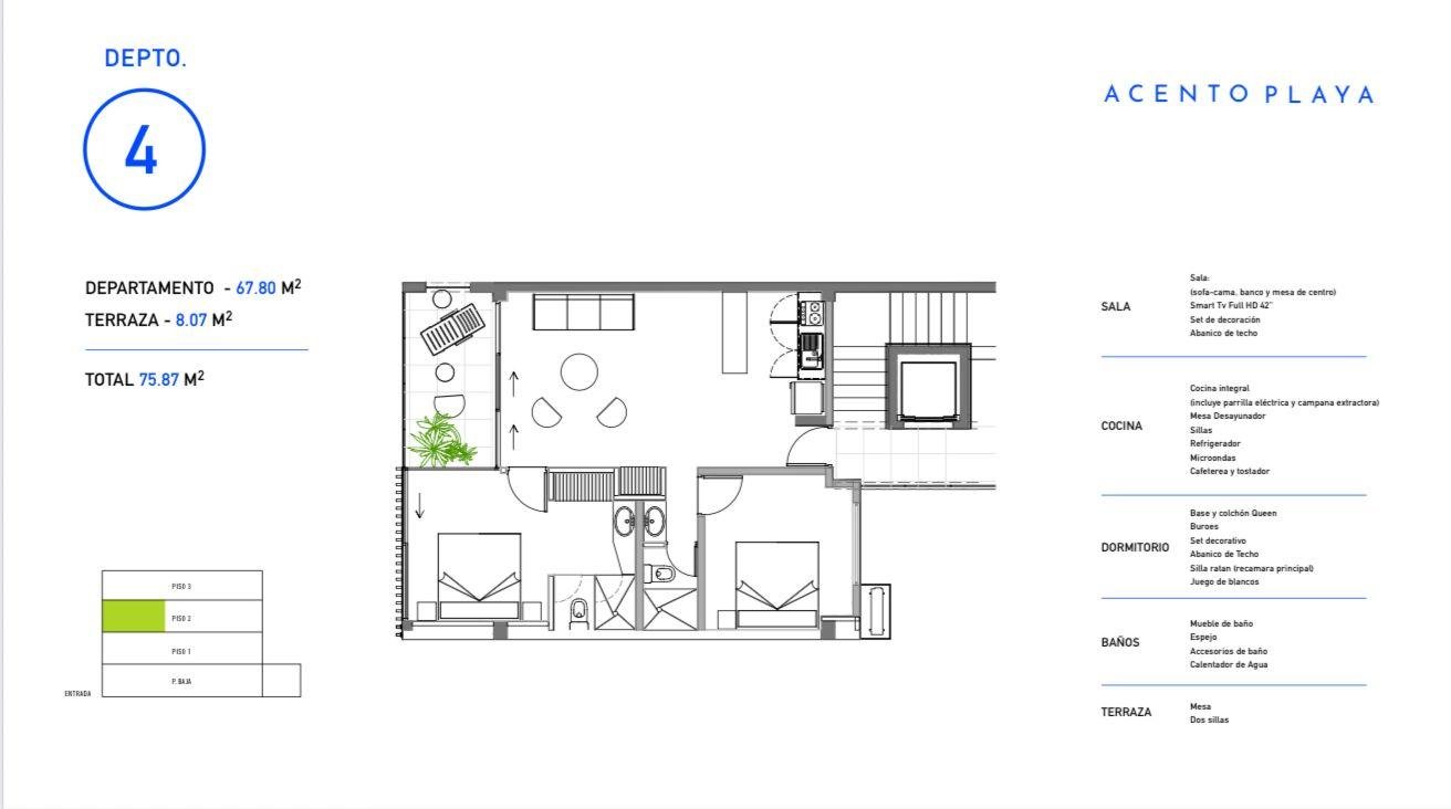 Acento Playa | Exclusivo Proyecto Boutique en Playa del CarmenDescripción:Sumérgete en el lujo y la comodidad a pocos metros de la icónica 5ª Avenida de Playa del Carmen. Acento Playa te ofrece exclusividad y elegancia en un entorno vibrante y cultural. Este proyecto boutique consta de solo seis exclusivos departamentos completamente equipados, diseñados para ofrecer la máxima calidad de vida.Características del Departamento:Superficie Total: 75.87 m²Recámaras: 2 espaciosas habitacionesBaños: 2 baños completosEquipamiento: Departamentos full equipados con acabados de alta calidad, listos para ocuparse.Detalles del Equipamiento:Sala:Sofá-cama, banco y mesa de centroSmart TV Full HD 42″Set de decoraciónAbanico de techoCocina:Cocina integral (incluye parrilla eléctrica y campana extractora)Mesa desayunador con sillasRefrigeradorMicroondasCafetera y tostadorDormitorio:Base y colchón QueenBurósSet decorativoAbanico de techoSilla ratán en la recámara principalJuego de blancosBaños:Mueble de bañoEspejoAccesorios de bañoCalentador de aguaTerraza:Mesa y dos sillasBeneficios del Proyecto:Ubicación Premium: A solo unos pasos de la famosa 5ª Avenida, donde la cultura, gastronomía y entretenimiento se fusionan.Diseño Moderno: Arquitectura contemporánea que optimiza los espacios y la luz natural.Exclusividad: Solo 6 unidades, ideal para quienes buscan privacidad y confort en un entorno de alto nivel.Inversión Atractiva: Precio de lanzamiento de solo $260,000 USD.Amenidades:Sky lounge con vistas panorámicasPiscina en la azoteaGimnasio equipadoSeguridad 24/7Estacionamiento privadoPrecio: $260,000 USD