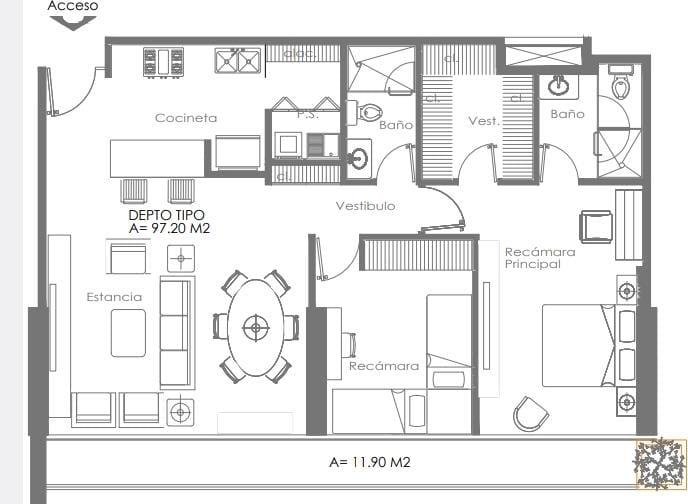 Detalles:-Recámara principal con vestidor y baño completo; salida al balcón. -2 Recámaras-2 baños de lujo-Sala/Comedor -Cocina integral-área de lavado Balcón 11.90 m21 Bodega2 estacionamiento