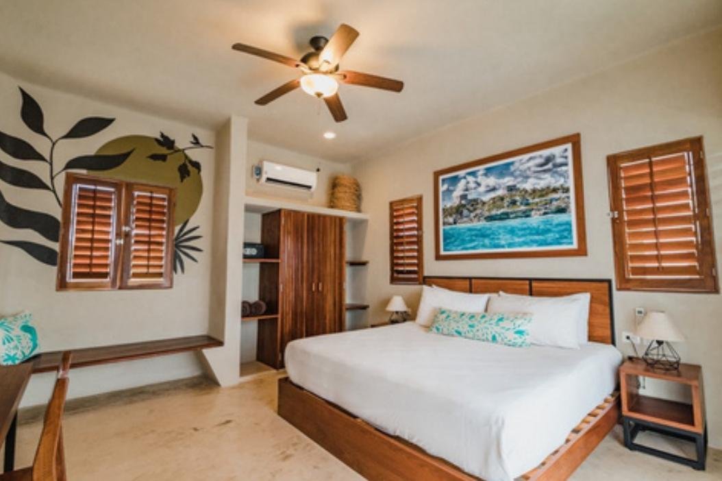 Amenidades y servicios destacadosBlue Palm cuenta con ocho habitaciones completamente equipadas y amuebladas, cada una de 25 m². Cada espacio ofrece un refugio de confort con aire acondicionado, TV inteligente, minibar, caja fuerte y un baño privado. Los balcones o terrazas, con sus hamacas y sillas Acapulco, invitan a la relajación, creando un ambiente de tranquilidad.